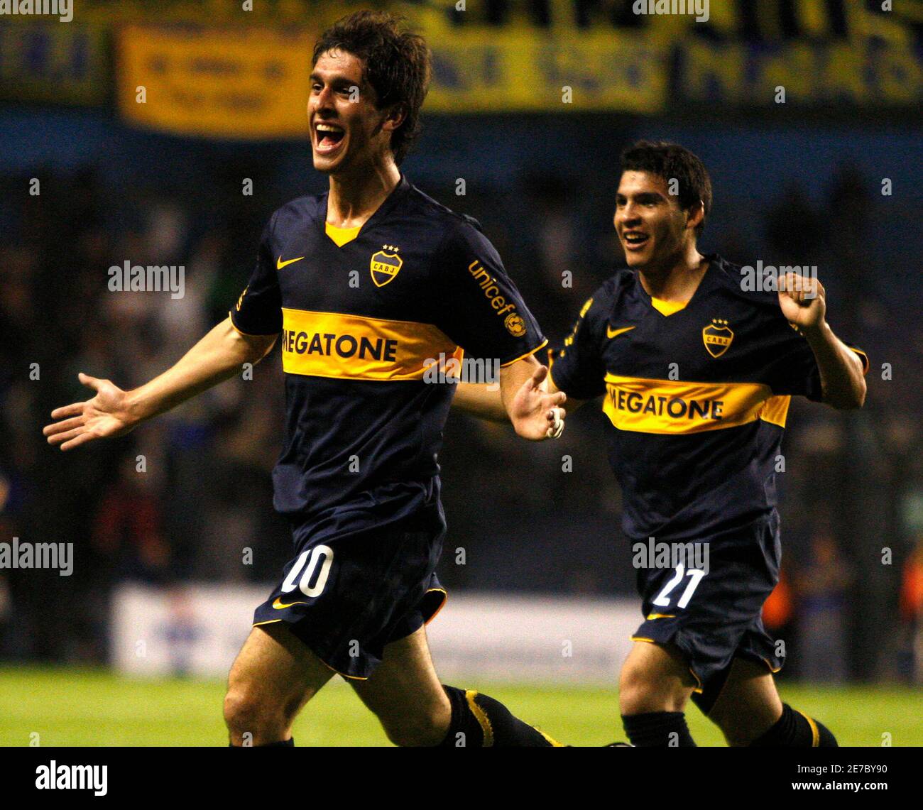 Juan Vorderster L Und Cristian Chavez Argentiniens Boca Juniors Feiern Ihr Team Tor Gegen Ecuadors Liga Deportiva Universitaria Wahrend Der Copa Sudamericana Fussballspiel In Buenos Aires 23 September 2008 Reuters Enrique Marcarian Argentinien