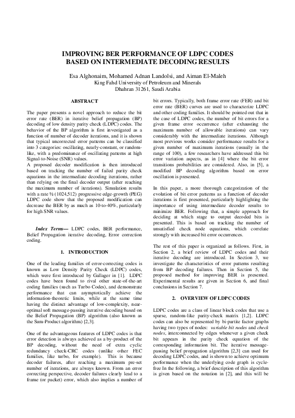 Pdf Improving Ber Performance Of Ldpc Codes Based On Intermediate Decoding Results Aiman H El Maleh Academia Edu
